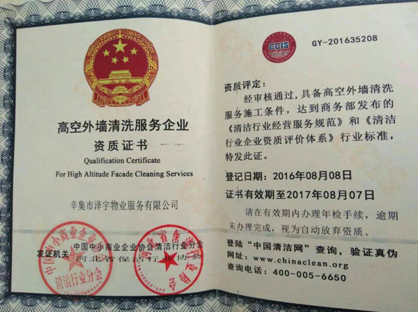 高空外墻清洗服務(wù)企業(yè)資質(zhì)證書(shū)